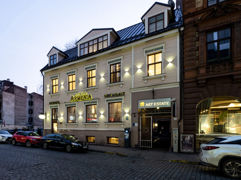 Напротив Galerija Rīga, в элегантном и современном здании с закрытым двором.
